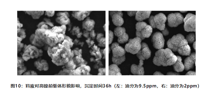 在實(shí)際生產(chǎn)過(guò)程中,少量的有機(jī)溶劑會(huì)對(duì)共沉淀反應(yīng)造成很大困擾,而鎳鈷錳原料提純過(guò)程中會(huì)用到有機(jī)溶劑,少量的有機(jī)溶劑會(huì)帶到前驅(qū)體的反應(yīng)中。料液油分越高,振實(shí)密度越低,前驅(qū)體的形貌變得疏松,無(wú)法成球,造成顆粒無(wú)法生長(zhǎng),粒度分布寬化。